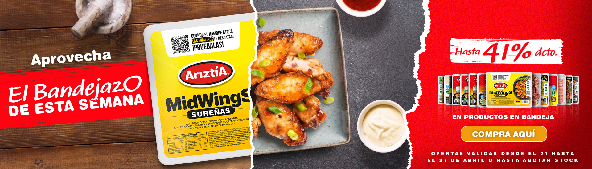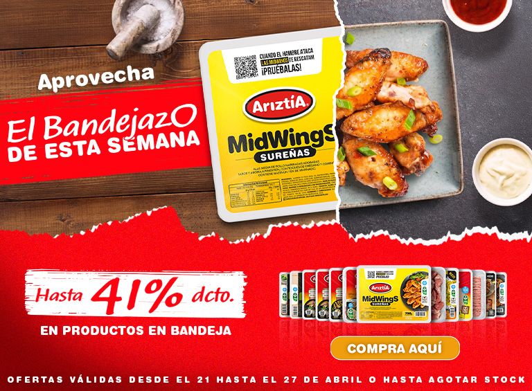 Midwings Sureñas 750 gr Ariztía ($4.267 kg)Precio especial $3.200 Precio referencial $5.390Precio x kg: $4.267