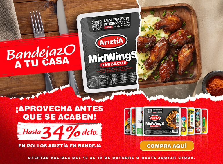 DCTOAlitas de Pollo Barbecue 750 gr Ariztía ($4.867 kg)Precio especial $3.650 Precio referencial $4.690Precio x kg: $4.867